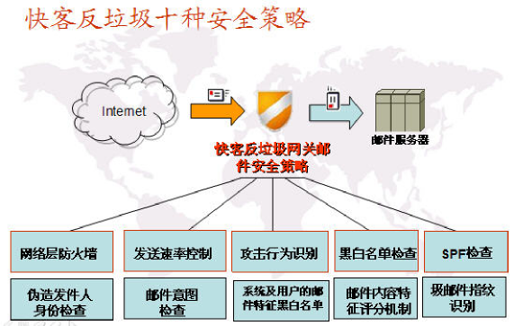 快客邮件安全网关采用了十种安全防护,对访问系统的连接和进入系统的邮件进行层层保护,确保系统的安全、稳定运行,有效屏蔽垃圾邮件。