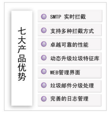 1、SMTP 实时拦截:能够高效地运行在邮件系统MTA ,对所有进入邮件系统的邮件及其附件文件和由邮件系统的发出的邮件及其附件文件进行实时反垃圾监测。