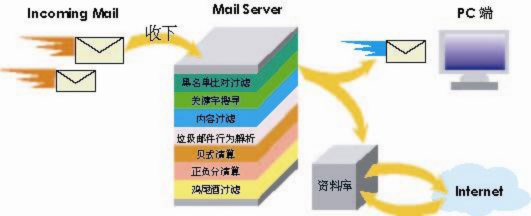 所有进入邮件均先由 Mail server 收下,再一一分层过滤筛选后才送达使用者 缺点:增加 Mail server loading、资料库必须每日更新。