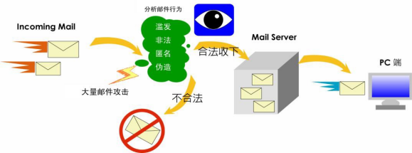 进入邮件先进行通讯行为解析,判断行为合法后才由 Mail server 收下。 优点:不会造成 Mail server loading、可有效防御大量邮件滥发攻击、针对木马程序,间谍程序,邮件病毒等恶意邮件均可有效拦阻。