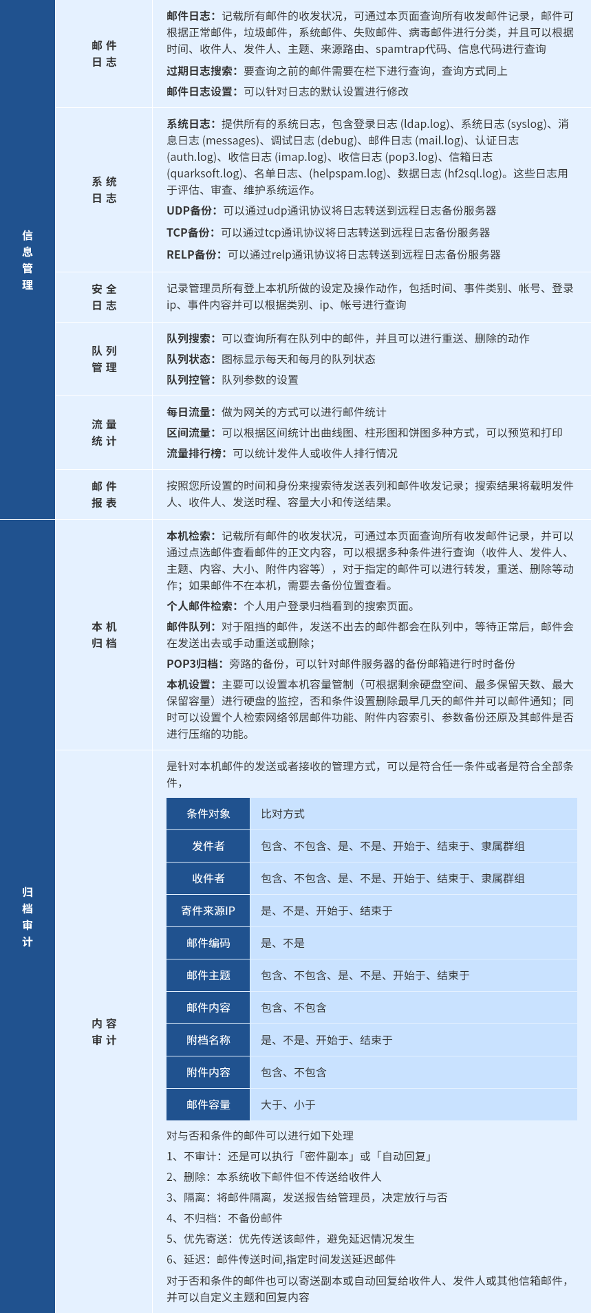 3、邮件灾难救援:当邮件服务器故障时,邮件可先暂存于系统中,待邮件服务器回复时,再将邮件送入;同时可以将遗失的个人邮件重新找回