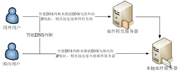 2、接收国外邮件:邮件服务器设有两条MX记录,通过智能DNS进行有效的判断对方的DNS服务器来源,根据DNS所在地域,有效的将连接转移到相应的服务器上。当国外用户发送邮件到国内邮箱,会根据国外的DNS解析进行判断,来源为国外的网络环境,即将邮件连接转到海外转发机上进行处理;邮件转发服务器同时起到邮件网关的作用,验证用户是否为本地用户,具有一定的反垃圾,抗攻击的作用。进行安全机制的检查后,获得通过的邮件得以顺利发送本地。当国内用户发送邮件到国内邮箱,同样根据DNS的来源,将邮件连接直接连接到国内的邮件服务器上进行处理。