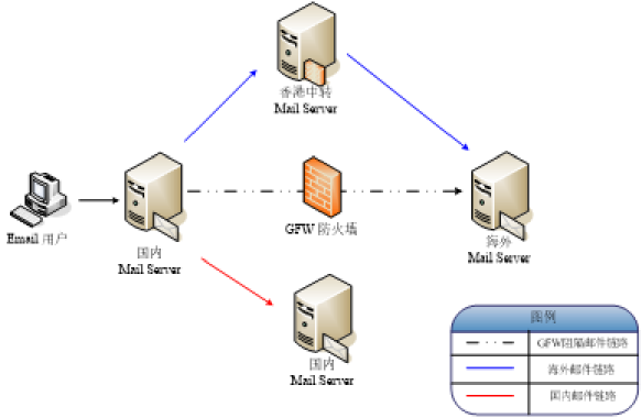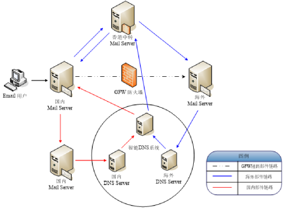 整套系统除包含用户邮件系统,还通过在美国、香港建设海外中转系统,进行有效的海外邮件中转服务,并且建立自身邮件系统的智能DNS平台,为邮件系统提供DNS服务。 如果正常的邮件发送到国内其他的邮件服务器只需通过正常的网络链路直接连接到对方的邮件服务器进行邮件的发送,而如果将邮件发送到国外的邮局系统,那么只需将邮件先发送到设置在香港的邮件中转服务器上,由中转服务器进行转发,投递到海外的邮件服务器。由于国内邮件服务器和香港中转服务器之间采用专线进行数据传输,可以有效的避开国家防火墙对于网络链路层的过滤,保障邮件能够正常的投递到海外的邮件服务器。如下图: